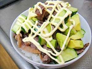 簡単 早い 牛こま切れ肉でアボカドきゅうりマヨ丼 レシピ 作り方 By シ閏 楽天レシピ